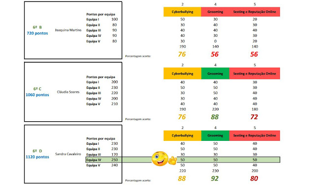 Aqui ficam as pontuações por turma e equipa, com o desempenho por tema.